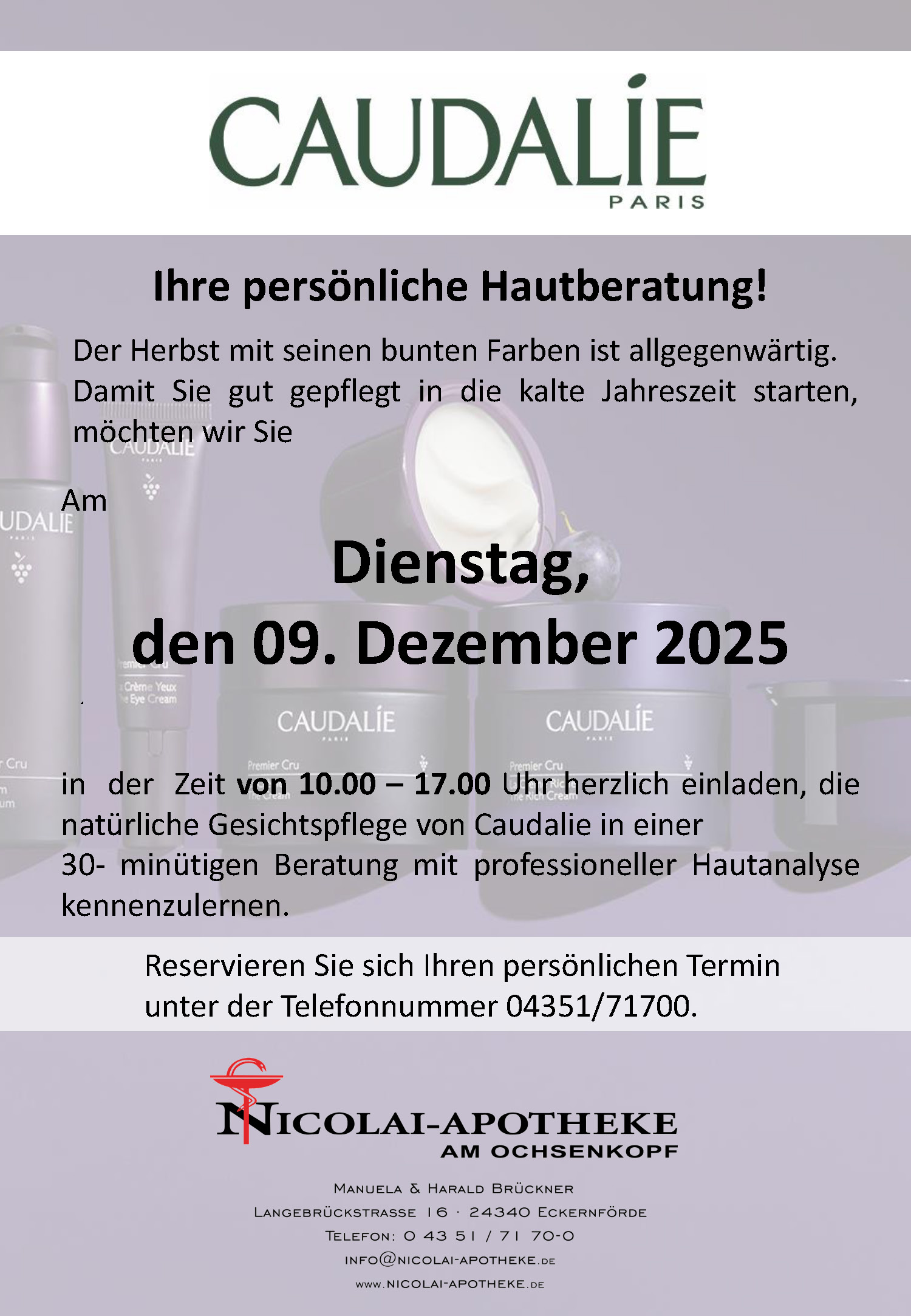 Damit Sie gut gepflegt in die kalte Jahreszeit starten, möchten wir Sie herzlich einladen, die natürliche Gesichtspflege von caudalie in einr 30-minütigen Beratung mit professioneller Hautanalyse kennenzulernen.