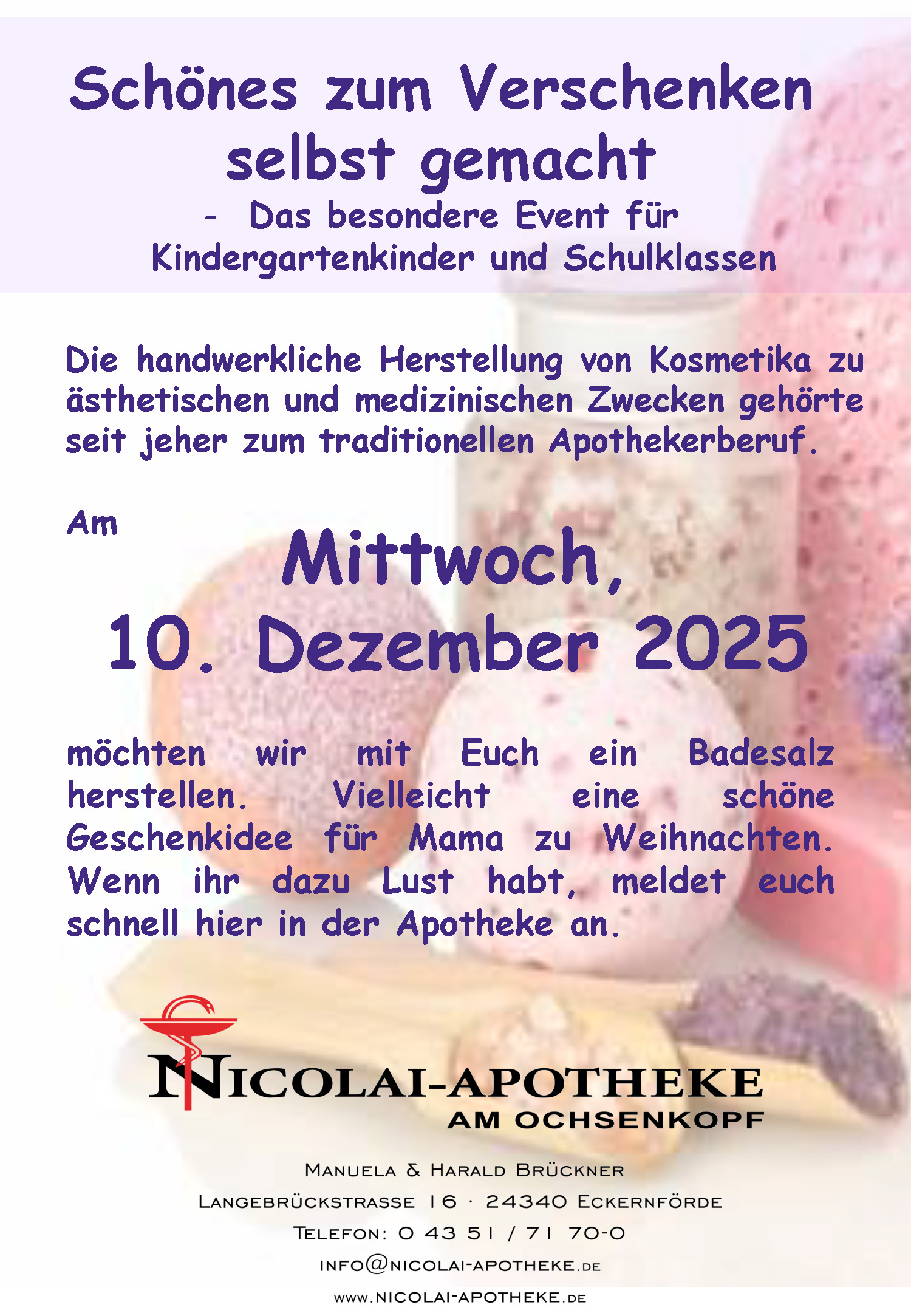Am Mittwoch, den 10, Dezember 2025 möchten wir mit Euch ein Badesalz herstellen.